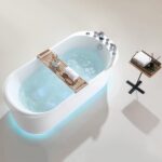 Banheira de massagem independente avental de 1 lado, interruptor e regulador pneumático para massagem de água, 2 travesseiros, decoração de vidro temperado e corrimão de aço SS304 T: 1500*1500*630