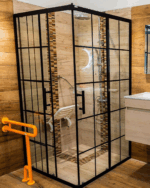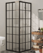 Cabine de duche com duas portas de correr e dois vidros fixos, estrutura de aço inoxidável preta, Vidro transparente temperado de 8mm, maçanetas das portas em aço inoxidável sem base e ralo.