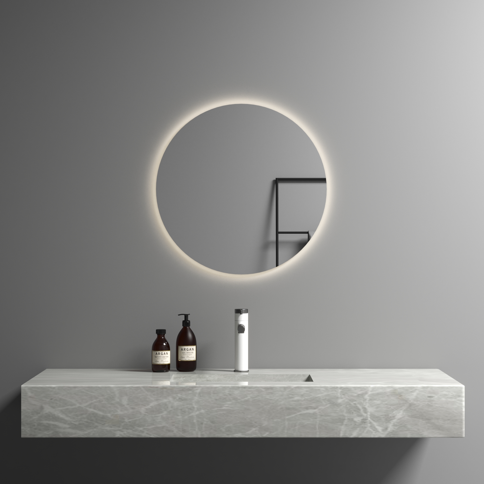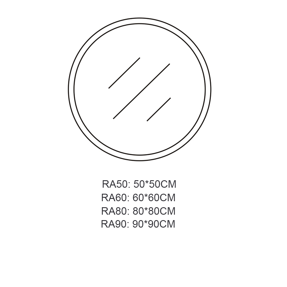 Espelho com luz LED de 3 cores, sem moldura de 4 mm, com tampa traseira em PVC, com interruptor de toque único, com certificado CE, e com 3 anos de garantia.