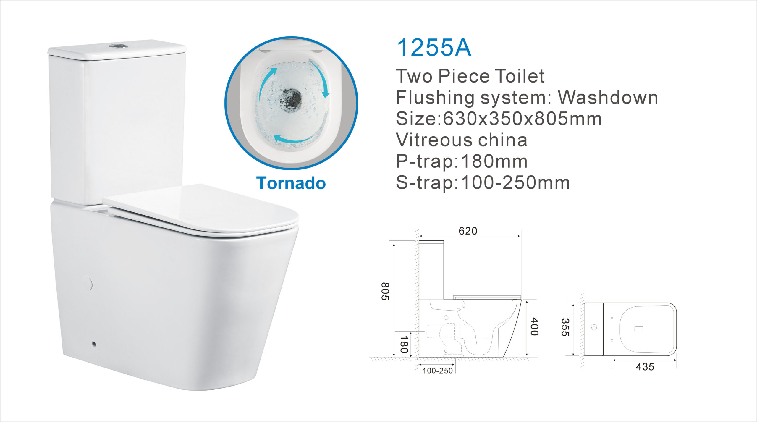 Vaso sanitário Tornado de duas peças com capa de assento em UF tamanho: 630 x 350 x 795 mm, sifão em P, 180 mm de desbaste